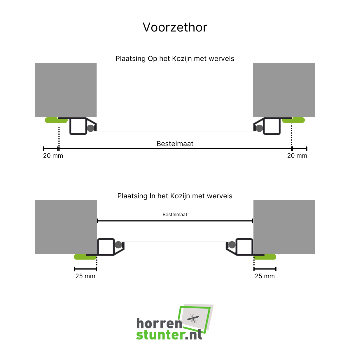 De voorzethor is geschikt voor een naar buiten draaiend raam en dakraam, onderstaand vindt je de meetinstructies.